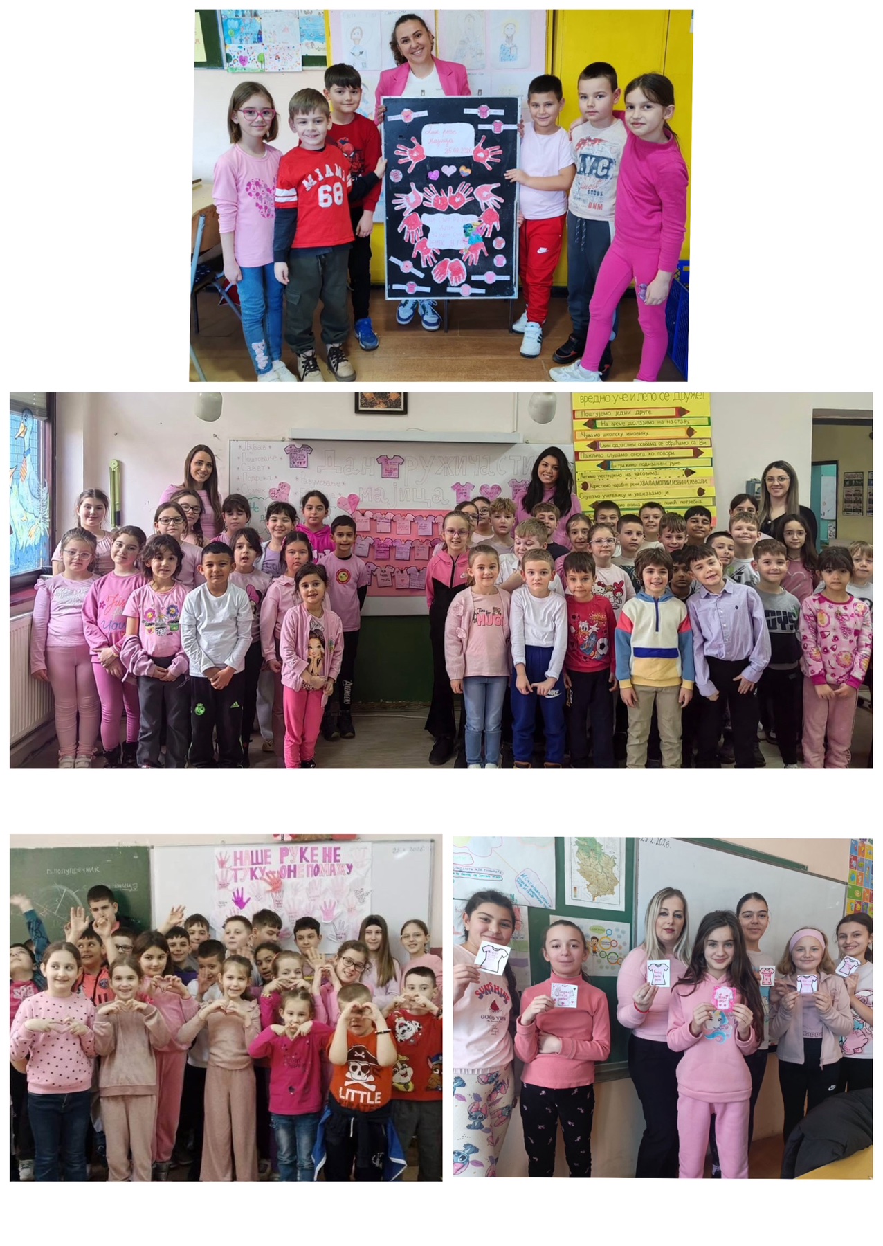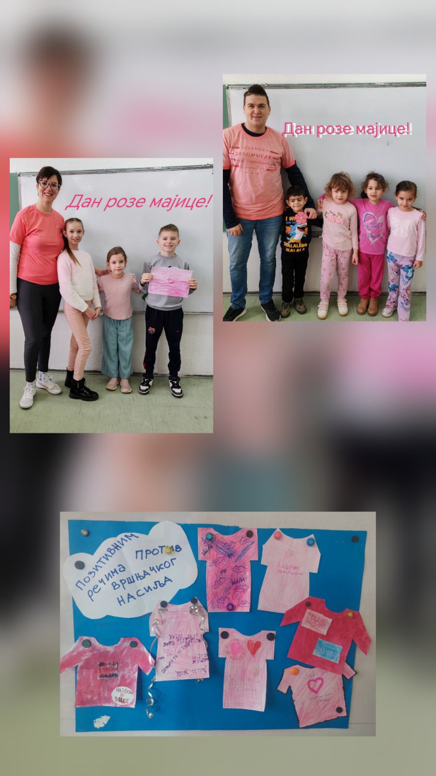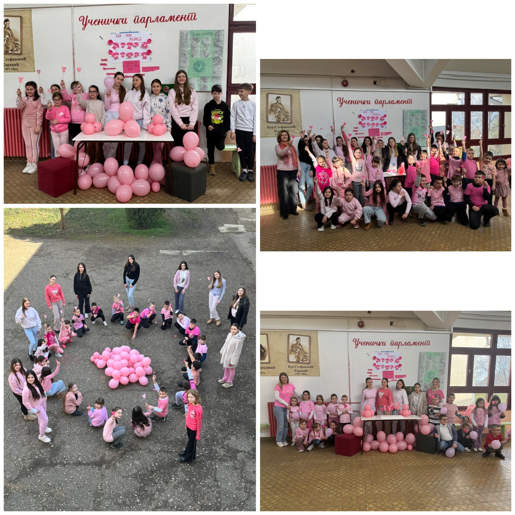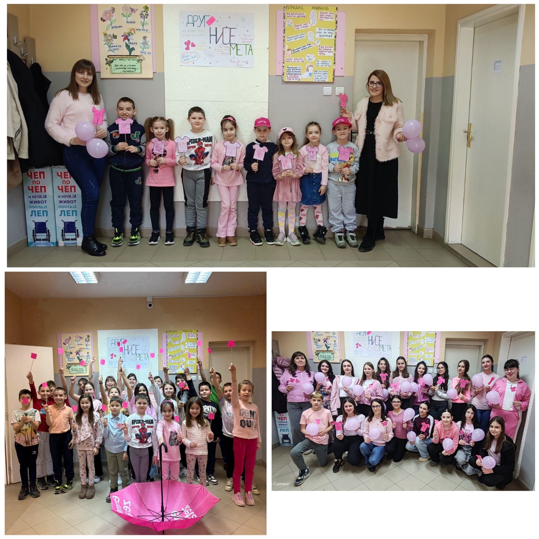 „Обасипајмо љубазношћу и добротом све у нашој околини“ – слоган под којим су ученици, васпитачи, наставници и учитељи наше школе уз подршку чланова Вршњачког тима и Ученичког парламента симболично обележили Дан розе мајица – Међународни дан борбе против вршњачког насиља.
